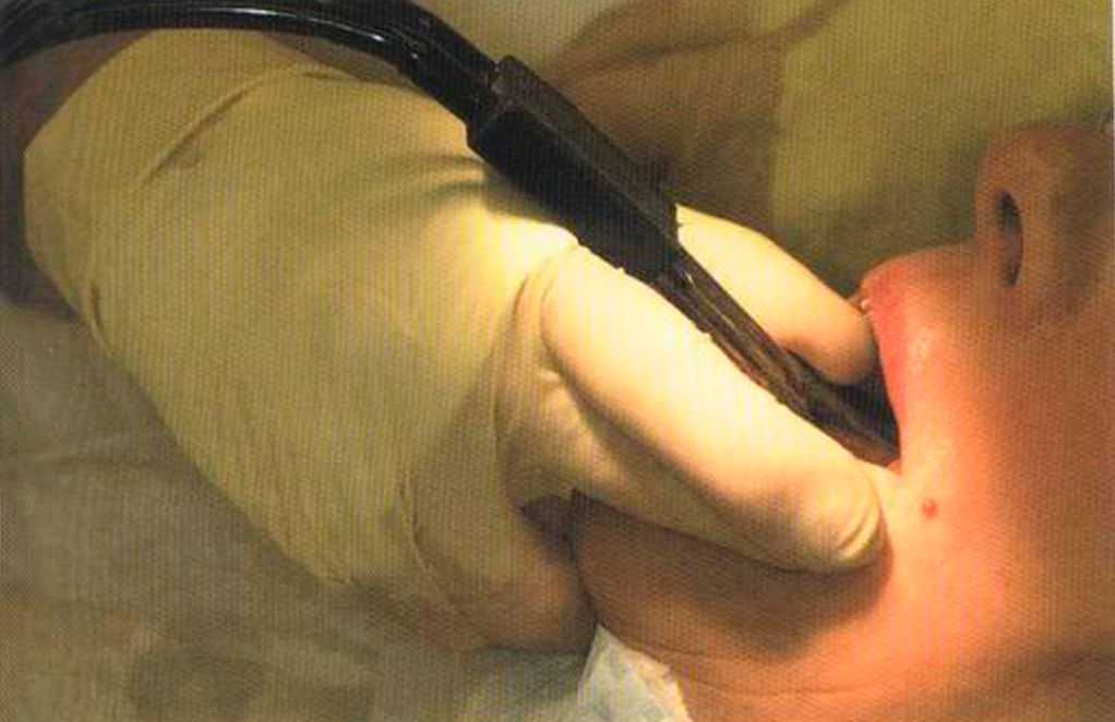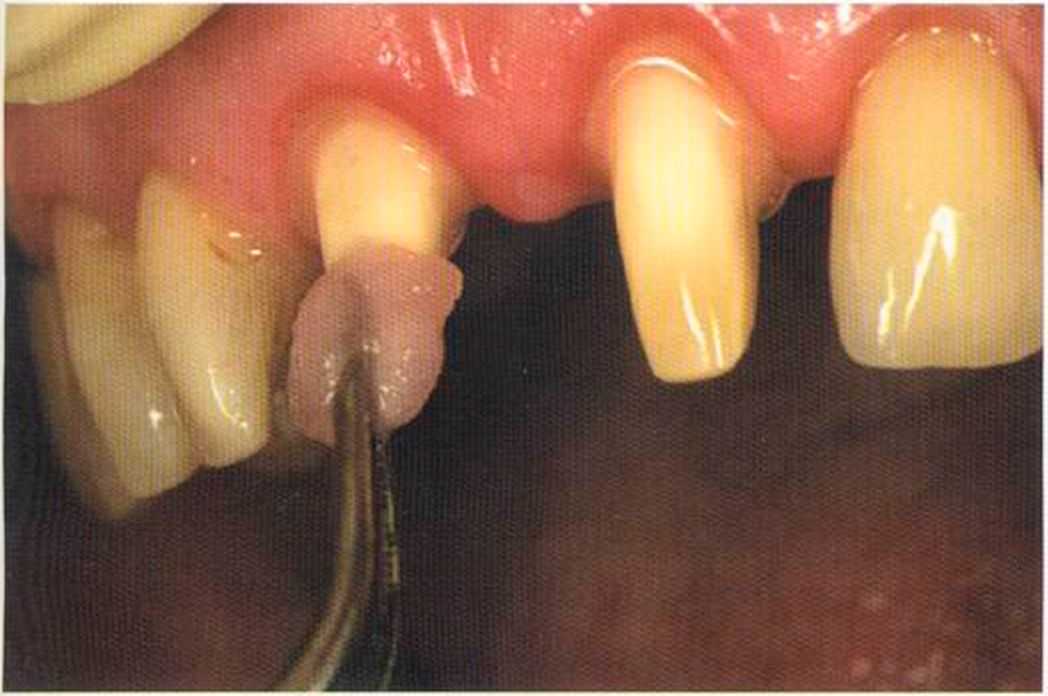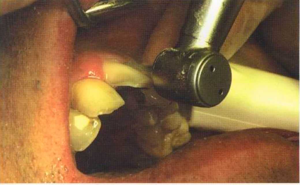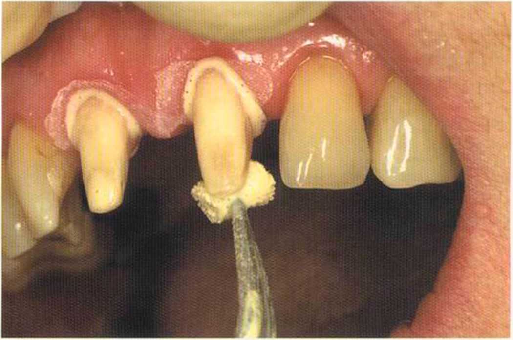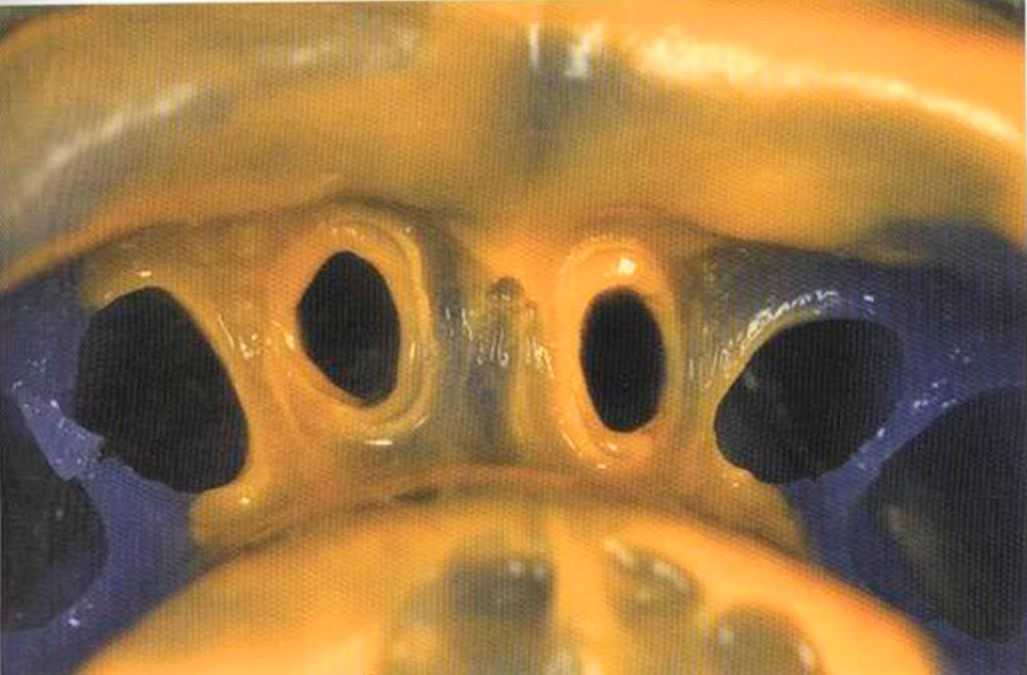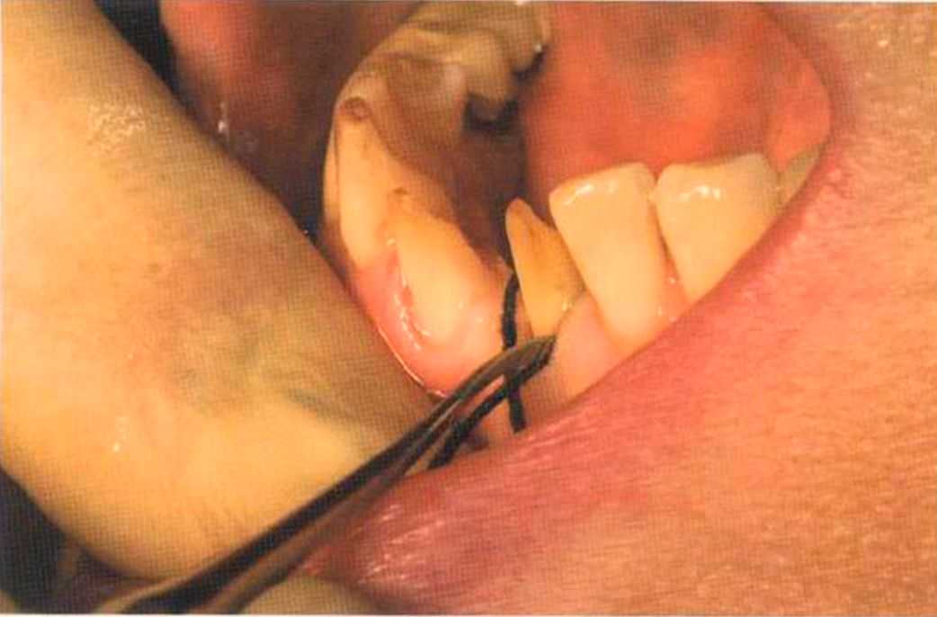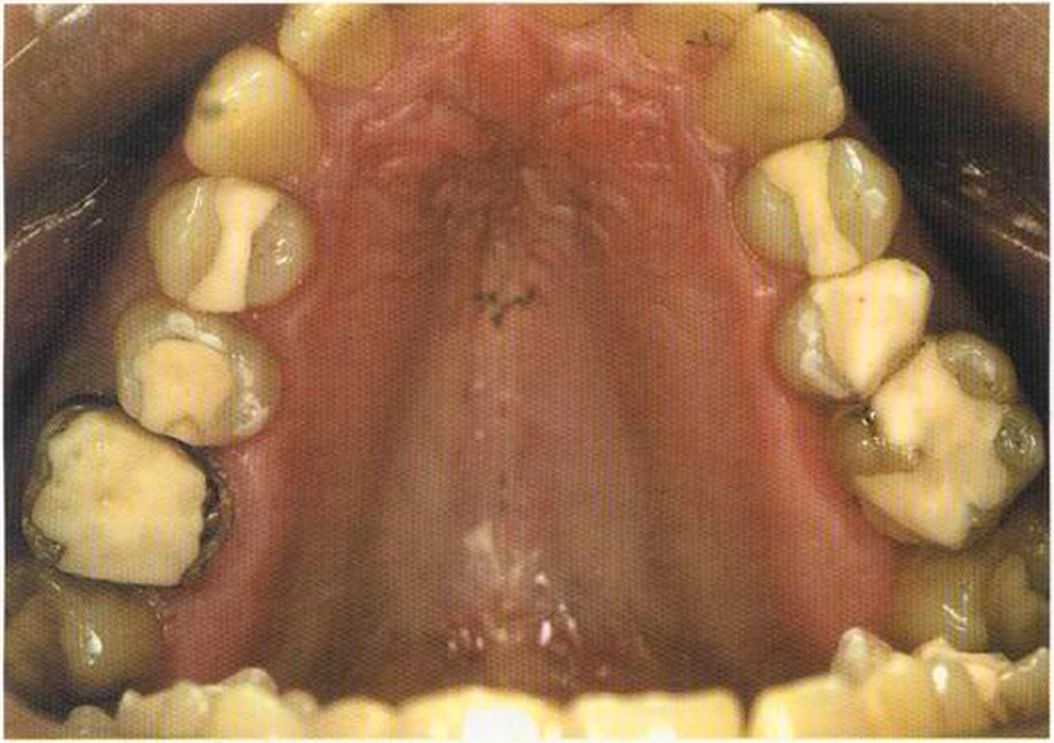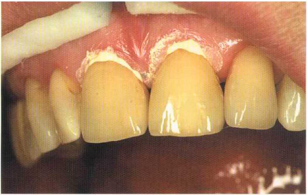 Этот пациент — португалец. Он всю жизнь имел такое положение зубов. Небнорасположенный боковой резец теперь необходимо удалить, а затем воссоздать как эстетику, так и функцию в области фронтальной группы зубов. Планируется изготовить коронки In-Ceram в области 11 и 21 и соединить их вместе из-за увеличивающейся подвижности зубов.