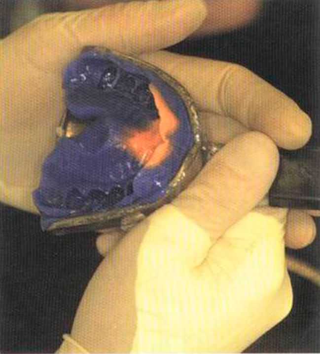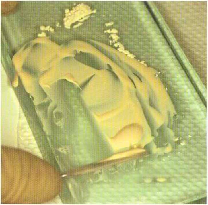 Используем соответствующий дублирующий материал фирмы Vita. Две половины, снабженные «ключом», заполняем жидким Zirconia по отдельности, затем соединяем. Соединенные половины на одну минуту ставим на вибратор для оптимального смешивания материала.