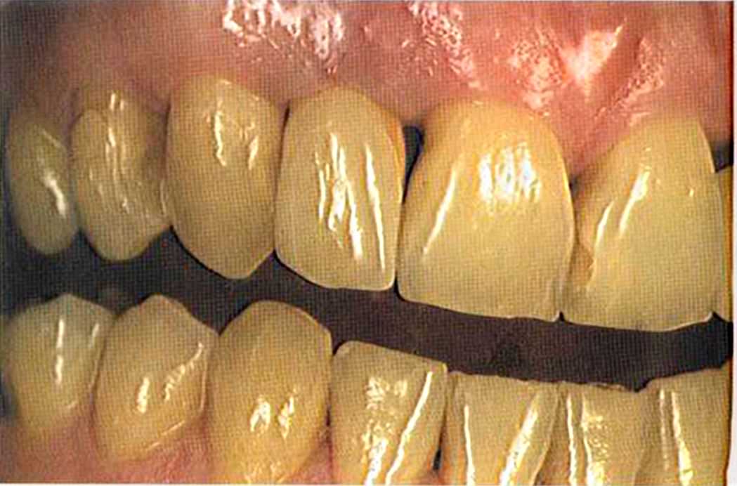 Только что зацементированная работа в полости рта. Цементирование керамических вкладок осуществлено на цемент двойного отверждения Vivadent, а коронок ln-Сегат на Panavia ТС.