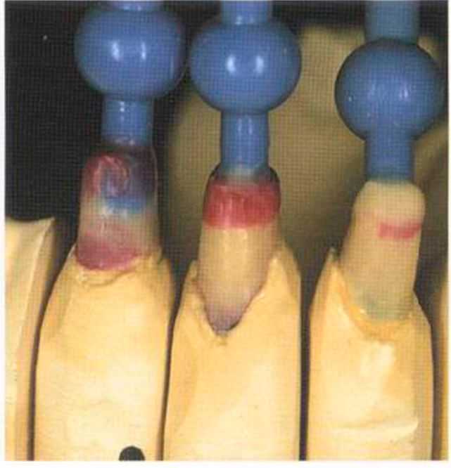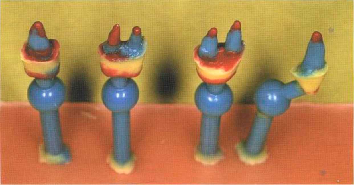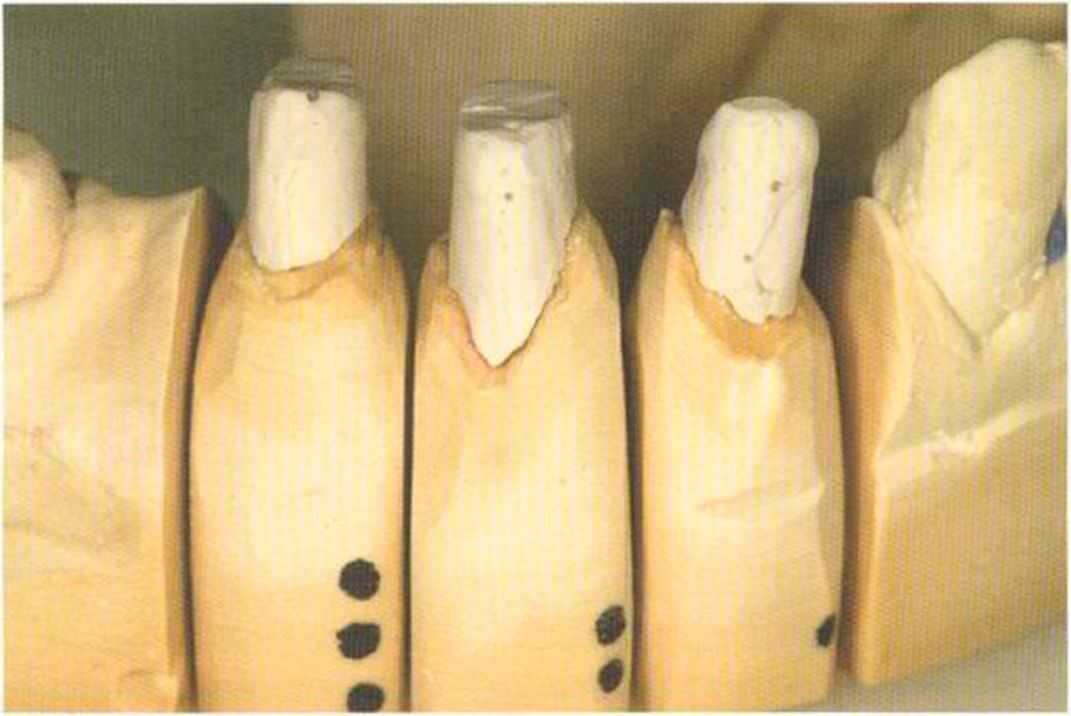 изготовления моделей и установки в артикулятор штифты моделируем из воска аналогично методике изготовления культевых вкладок из золота. Прилитые воском депо имеют в этом случае особое значение.