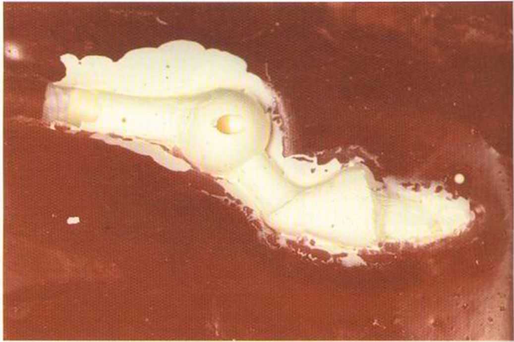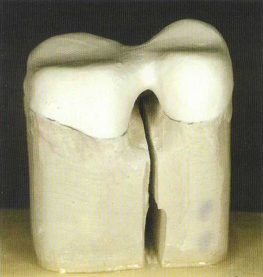 Увеличение коронки In-Ceram в области 21 показывает, как сделанные с небной стороны пазы на режущем крае воспроизводят транспарентный эффект. Образцом служил 11 зуб.