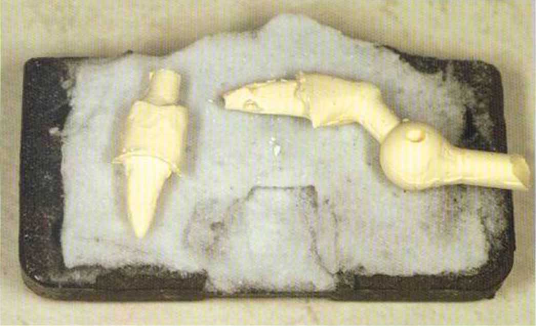 Для изготовления индивидуальной литейной формы, которая в данном случае должна состоять из двух частей, отливаемые объекты приклеиваем воском на восковую пластинку.