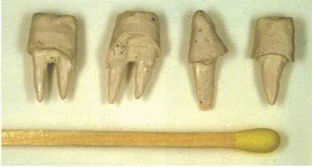Соотношение размеров готовых вкладок и спички. Они маленькие, но требуют много работы и могут быть очень полезны пациенту.