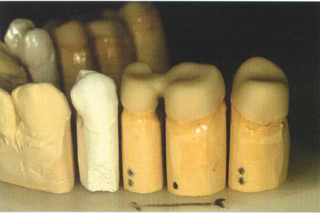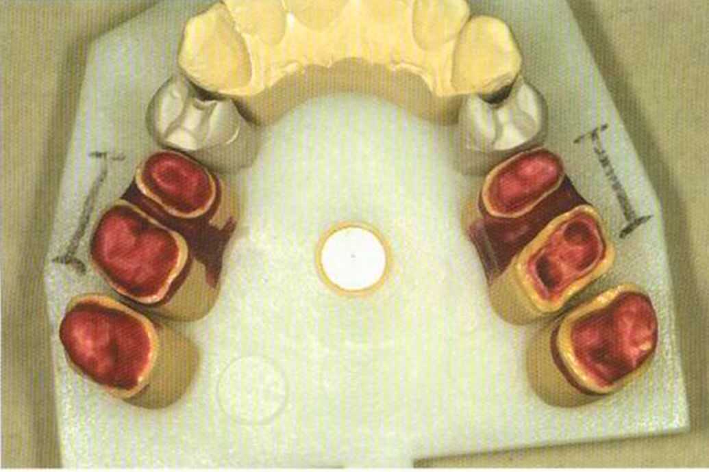Уже готовая рабочая модель с огнеупорными штампиками 14 и 24 из VITADUR-Vest. На них очень просто наносим слоями керамические массы и обжигаем. По сравнению с прессованными керамическими вкладками, послойно нанесенные выглядят всегда естественнее, даже когда в полости рта необходимо провести пришлифовывание. При использовании различных масс — дентина, эмали или транспарента - реставрация получается похожей на живой зуб. Штампики под коронки In-Ceram перед дублированием покрываем тонким слоем воска.