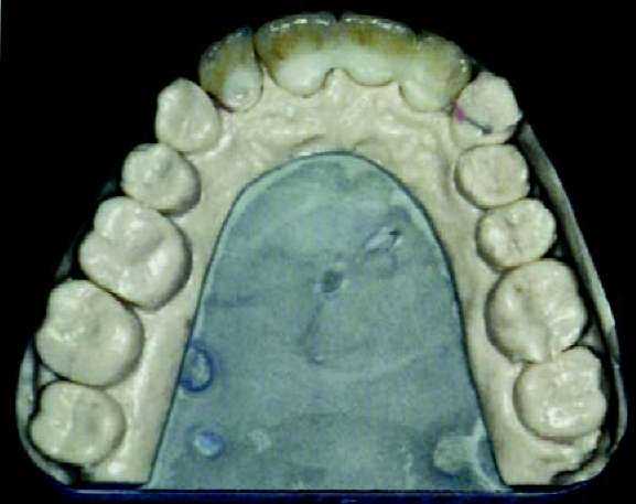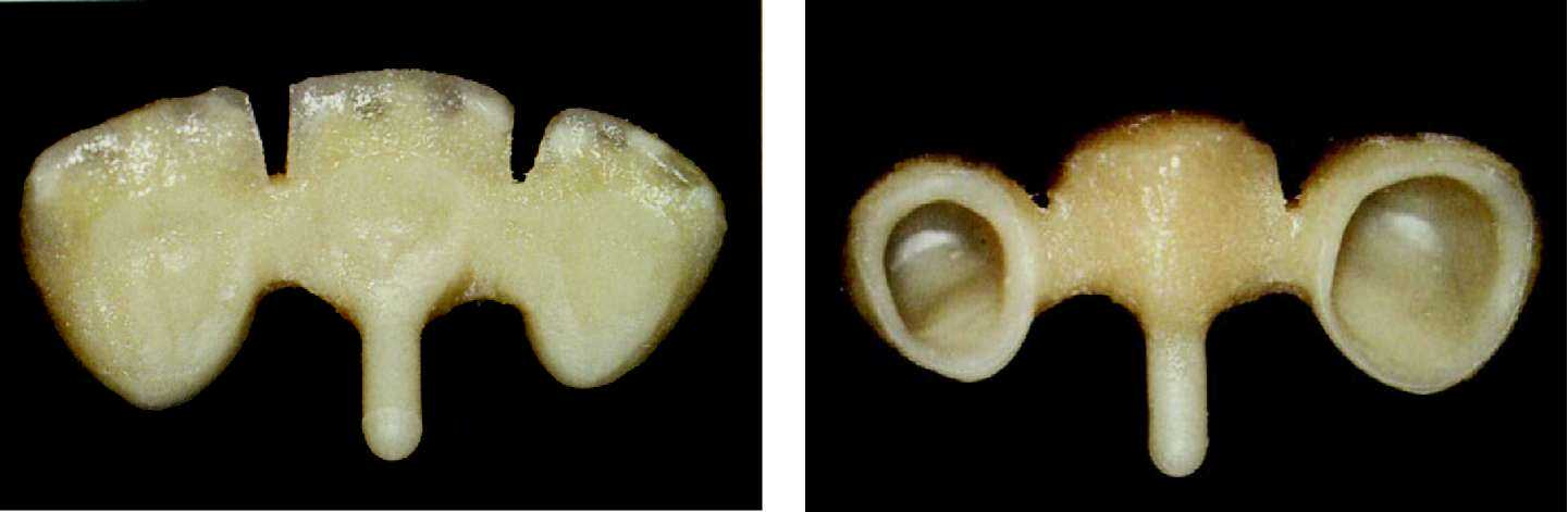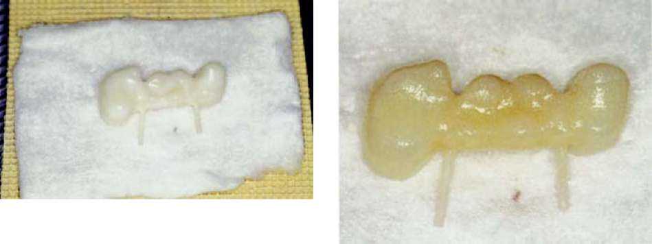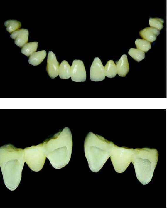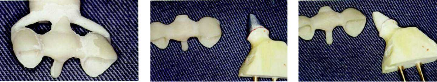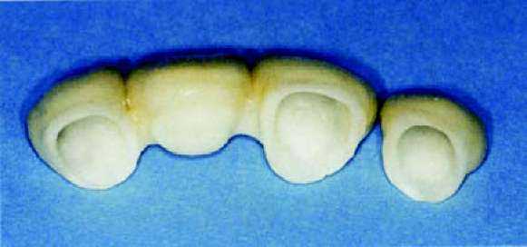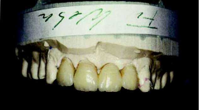 метрах обжига. Важно только отметить, что при изготовлении керамики путем наслоения апатита фтора мы ведем речь о материале, который требует обжига при температуре 760 — 800 °С. Более подробную информацию, вы можете получить из таблиц фирмы-производителя. После первого обжига мы вынимаем каркас нашего внимания из печи без его длительного охлаждения и ждем, пока он не достигнет комнатной температуры. После этого под микроскопом исследуются внутренние стороны коронок. Если на внутренней стороне остались излишние частицы керамики, которые попали на внутреннюю сторону при нанесении кисточкой массы для уплотнения, то их можно легко удалить алмазным шариком, после чего проводится примерка на остове.
