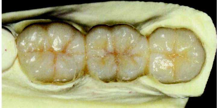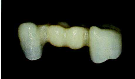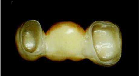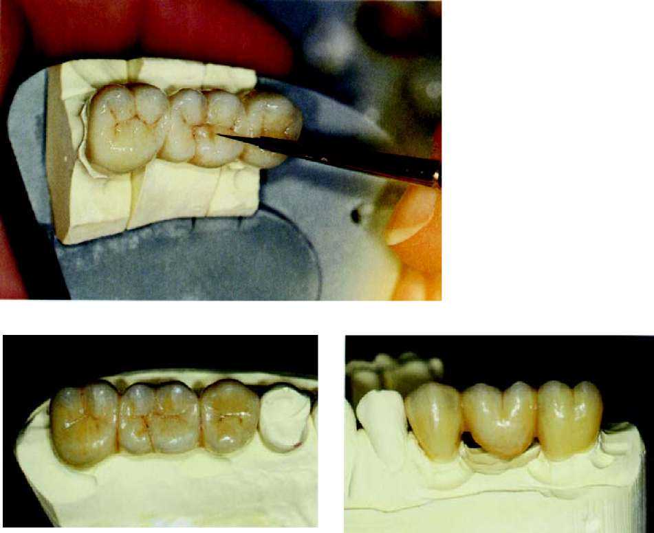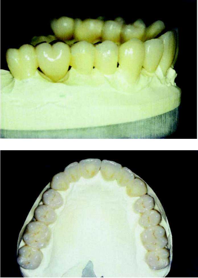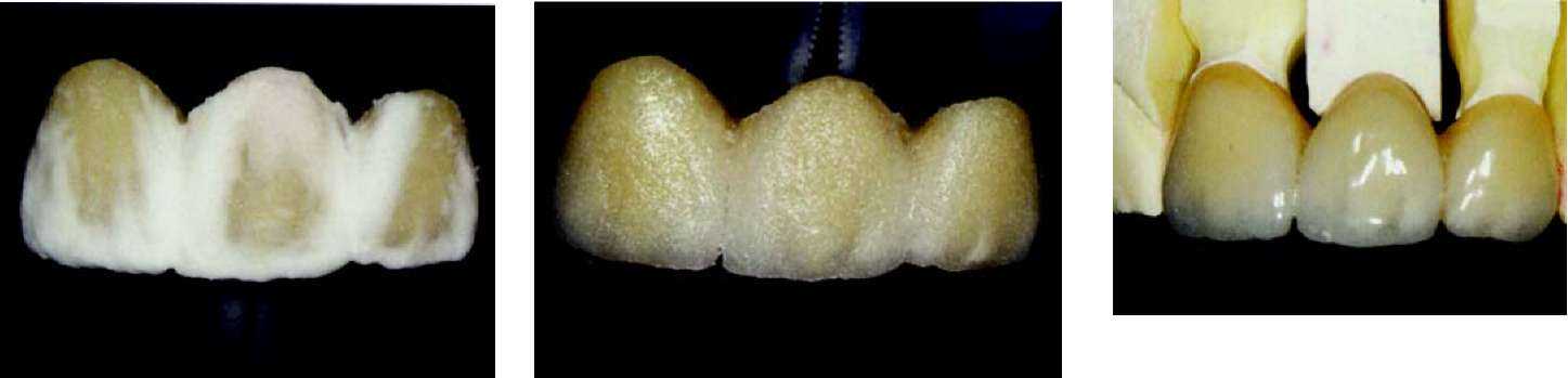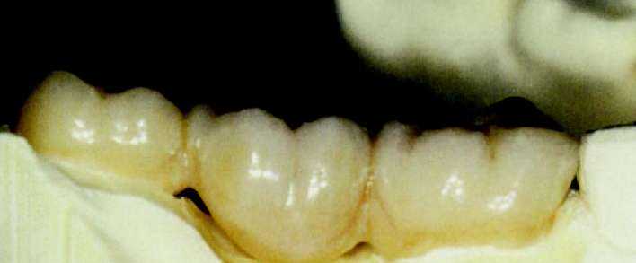 Рис. 63 и 64. Мост, покрытый глазурью. После этого проводится шлифование контактных пунктов с соседними зубами и, в случае необходимости проводится корректировка с помощью алмазного бора. Когда после этого мост садится на модель без какого-либо сопротивления, теперь в артикуляторе мы можем проконтролировать окклюзальную сторону и, в случае необходимости, с помощью алмазного шарика провести корректировку. В зависимости от степени уплотнения, нанесенной при наслоении керамической массы — готовая обожженная керамика в большей или меньшей степени уменьшается в объеме, и должна быть подкорректирована нанесением новой керамики (корректировочный обжиг с применением массы Add-on) и ее обжигом. Но прежде чем вновь наносить керамику, мы обрабатываем керамическую (пескоструйный аппарат) поверхность 110 мц оксида алюминия при давлении 2 бар и для очистки используем пароструй. Теперь мы дополняем недостающие части или уменьшенные в объеме межзубные области слоями керамики (масса add-on 780°С), вновь их уплотняем и производим обжиг моста во второй раз при максимальной температуре 780 °С. После этого проводится та же процедура, что и после первого обжига. Когда форма, посадка и окклюзия завершены, мы переходим к оформлению поверхности. Теперь прорабатываются аппроксимальные края буккальных поверхностей, а также текстура. Как ориентир мы используем естественные зубы пациента. Можно исходить из того, что у более возрастных пациентов. Поверхность зубов более гладкая, чем у более юных пациентов. У последних нам часто встречаются поперечные структуры, в виде неравномерных волн. Речь идет о перикиматиях, которые с течением времени гладко полируются и становятся практически невидимы. Если они сохранились в оставшихся зубах пациента, мы имитируем их с помощью тонких, алмазных шариков, для достижения эффекта «черепицы», наложенной друг на друга. |