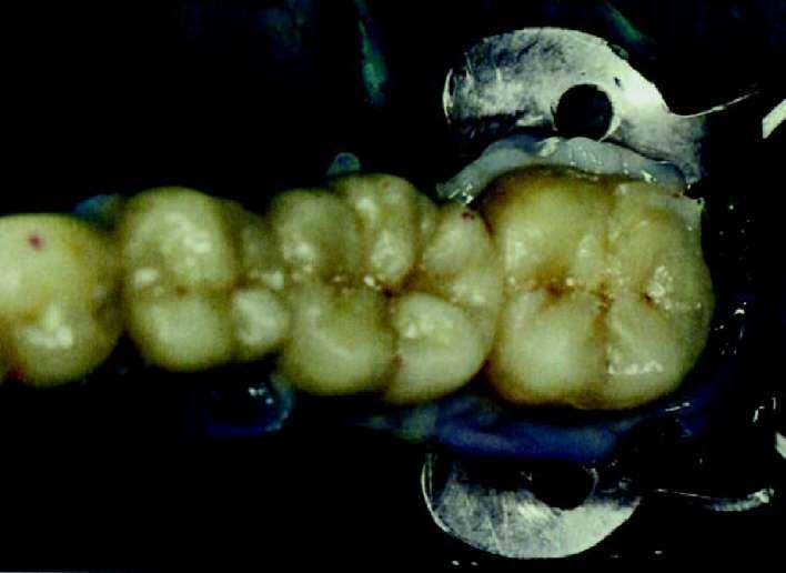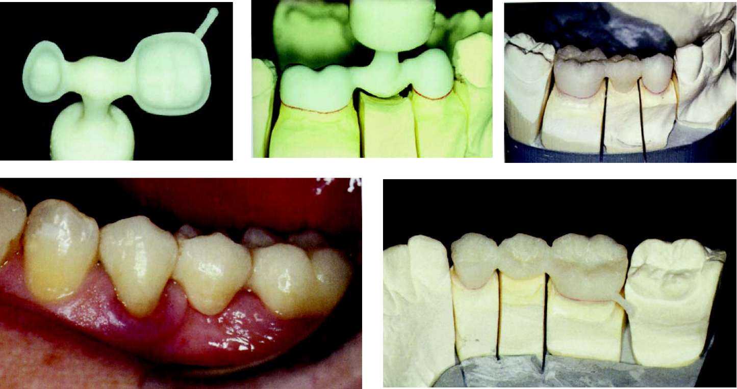 | Рис. 93—97. Случай: мост для боковых зубов, состоящий из 3-х частей. |