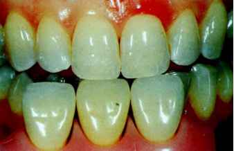 | Рис. 11. Влияние Gumy-сосочка на цвет пришеечной области зуба. |