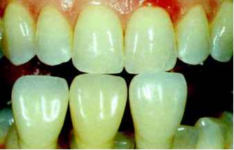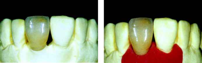 | Рис. 16. Светлые коронки на гипсе аналогичного цвета Рис. 17. Десневая маска корректирует влияние цвета смотрятся темнее. гипса и имитирует, реальную ситуацию полости рта. |