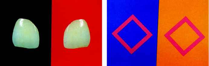 На рис. 1 показано влияние преобладающего цвета участков, окружающих белые зубы с неподкрашенными губами. На рис. 2 эти зубы выглядят значительно светлее, так как подкрашенные губы образуют более интенсивный цветовой контраст. Оптический эффект основан на физиологическом феномене синхронного контраста. Белое поле кажется еще более белым, если оно окружено черной рамкой. Это явление называют бесцветным синхронным контрастом. Для нашего зрения он имеет наибольшее значение. Контуры предметов выглядят в результате этого эффекта выраженнее, облегчая их восприятие. Так черные буквы данного текста мы видим темно-черными, так как белый цвет бумаги усиливает черный цвет букв. На рис. 3 винир на черном фоне смотрится светлее, чем винир на красном фоне. Наряду с бесцветным синхронным контрастом можно наблюдать и цветной синхронный контраст. Простой пример хорошо иллюстрирует этот эффект: если на красную бумагу положить небольшой лист серой бумаги и закрыть его тонкой бесцветной папирусной бумагой, то серый лист бумаги будет казаться зеленым. На желтой бумаге тот же серый бумажный лист выглядит голубоватым. На рис. 4. эффект цветного синхронного контраста прослеживается еще лучше. Фиолетовый четырехугольник на синем фоне кажется светлее или ярче, чем на желтом. Фиолетовый цвет меняется под действием цветового контраста. Так мы часто видим вместо серого цвета цветные фигуры, чаще голубые тени, например, при свете луны или ранним утром на белом снегу. Родственным и интересным оптическим феноменом является постепенный (последовательный) контраст. Если зафиксировать взгляд на несколько секунд на красном предмете, расположенном на темном фоне, а затем посмотреть на белую стену, то красный предмет будет казаться зеленым. Колбочки сетчатки глаз, чувствительные к красному цвету, и их нейроны адаптировались к цвету и благодаря освещению всего спектра становятся менее восприимчивы, чем колбочки сетчатки, чувствительные к зеленому и фиолетовому цветам, и их нейроны. Поэтому комплементарный цвет кажется зеленоватым». В полости рта зуб оптически разделяется на три цветовые сегмента. Режущий участок зуба ограничен темным фоном полости рта, апп-роксимальные участки — желтовато-красноватым цветом соседних зубов, пришеечная часть зуба обрамлена красными сосочками и десной. Эмаль зуба благодаря высокой прозрачности очень хорошо проводит свет, поэтому цвет сосочков «переходит» в цвет пришеечной части зуба, «наслаиваясь» на него. Так называемый эффект хамелеона способствует тому, что различия в цвете между соседними зубами взаимно выравниваются. Цвет десны генетически зависит от содержания меланина и бывает светло- или темно-красным. Часто присутствуют и незначительные фиолетовые оттенки. При короткой верхней губе во время смеха хорошо визуализируется широкая гирлянда десны, усиливающая яркость и «силу» зубов благодаря синхронному контрасту.