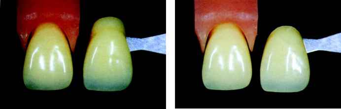 | красноватого оттенка, насыщенности и интенсивности. Японский специалист М. Ямамото очень наглядно описал эту проблематику. Он смоделировал из воска сосочек вокруг зуба расцветки и установил, что цвет шейки зуба изменился, стал светлее, получив желтоватый оттенок. С целью исследования нами были смоделированы десневые маски одной одиночной коронки из пластмассы Paladur (Heraeus Kulzer), которые мы расположили над различными зубами из расцветки. На рис. 7 видно, как маска меняет форму зуба и цвет его пришеечной части, обеспечивая более естественный вид. Становится ясна причина сошлифовывания шеек зубов-образцов расцветки многими врачами и зубными техниками (рис. 8). Но эти образцы являются реликвией и известны с тех времен, когда еще не было металлокерамики. Такие образцы выпускали лишь с целью подбора для зубных протезов искусственных зубов, которым нужна была база для фиксации в протезе. Правда, образцы с «шейками» смотрятся элегантнее и стройнее (рис. 7). |