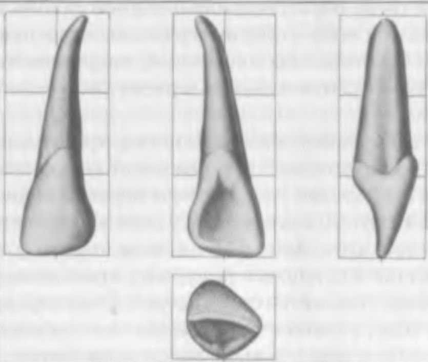 На небной поверхности этих зубов у лиц женского пала краевые гребешки хорошо заметны, нередко доходят до режущего края. Для мужских зубов характерна уплощенность небной поверхности со слабо выраженными краевыми гребешками. Небный бугорок по форме довольно изменчив, но чаще всего наблюдается его расщепление. Переход контуров коронки в соответствующие им контуры корня заметнее выражен у мужчин, причем с листал ьной стороны больше, чем с медиальной.