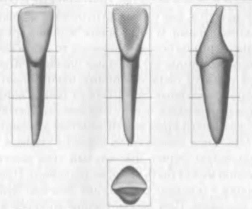 У нестершнхся зубов на прямом режущем крае имеются достаточно выраженные бугорки. Наибольшая выпуклость апроксимальных контуров чаще располагается в окклюзионной трети коронки.