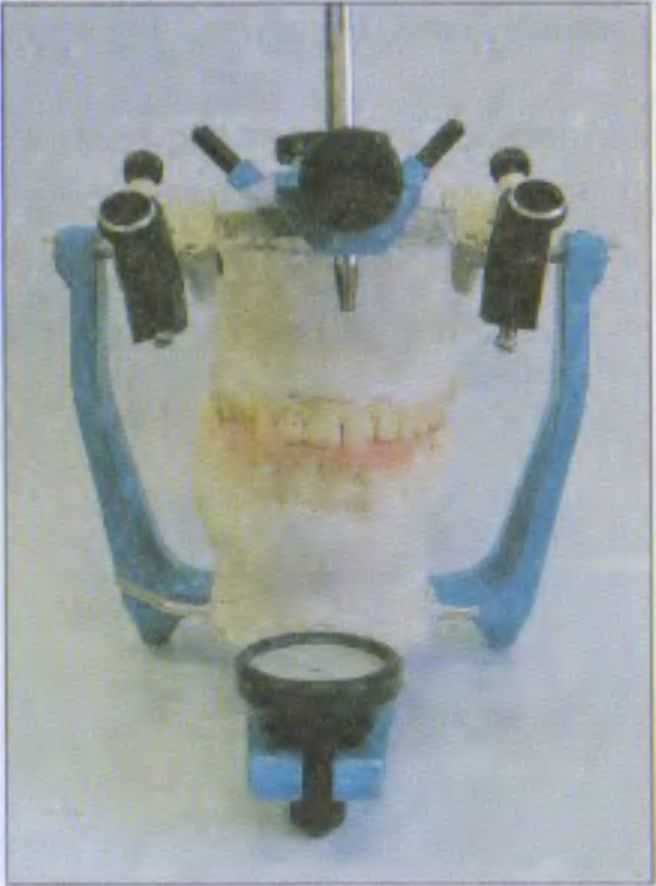 4) по полученной окклюдограмме загипсованные в артикуляторе модели челюстей фиксируют в положении передней окклюзии;.