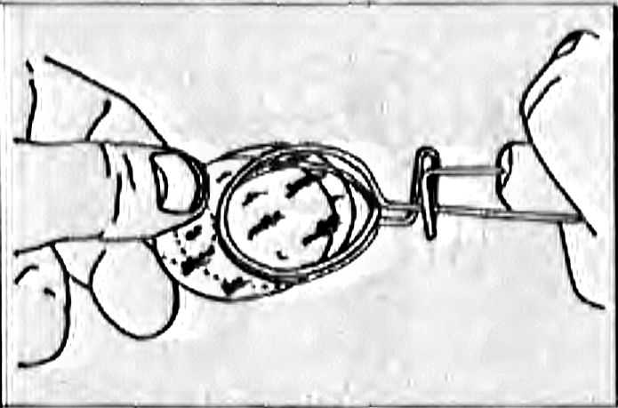 Для изготовления колпачка два сложенных вместе пластмассовых диска закрепляют в специальном зажиме и нагревают над пламенем горелки до пластичного состояния (рис. 103,104). Появление прозрачности по всей поверхности пластмассы свидетельствует о готовности ее к дальнейшей работе. Диски устанавливают над кюветой, заполненной силиконом или техническим пластилином, и вдавливают в них модельную культю препарированного зуба, полностью погружая ее в кювету (рис. 105). Такая процедура позволяет получать колпачок равномерной толшины с компенсационным пространством, полученным после удаления внутреннего катпачка толщиной 0,1 мм (рис. 106, а, б, в). При остывании пластмасса быстро твердеет. Приготовленный пластмассовый колпачок снимают с модельной культи зуба и укорачивают на 1 мм выше уступа (рис. 106, г). Моделировочным воском тина «Лавакс» уточняют колпачок в области уступа (рис. 107) и передают его в литейную лабораторию для замены металлом.