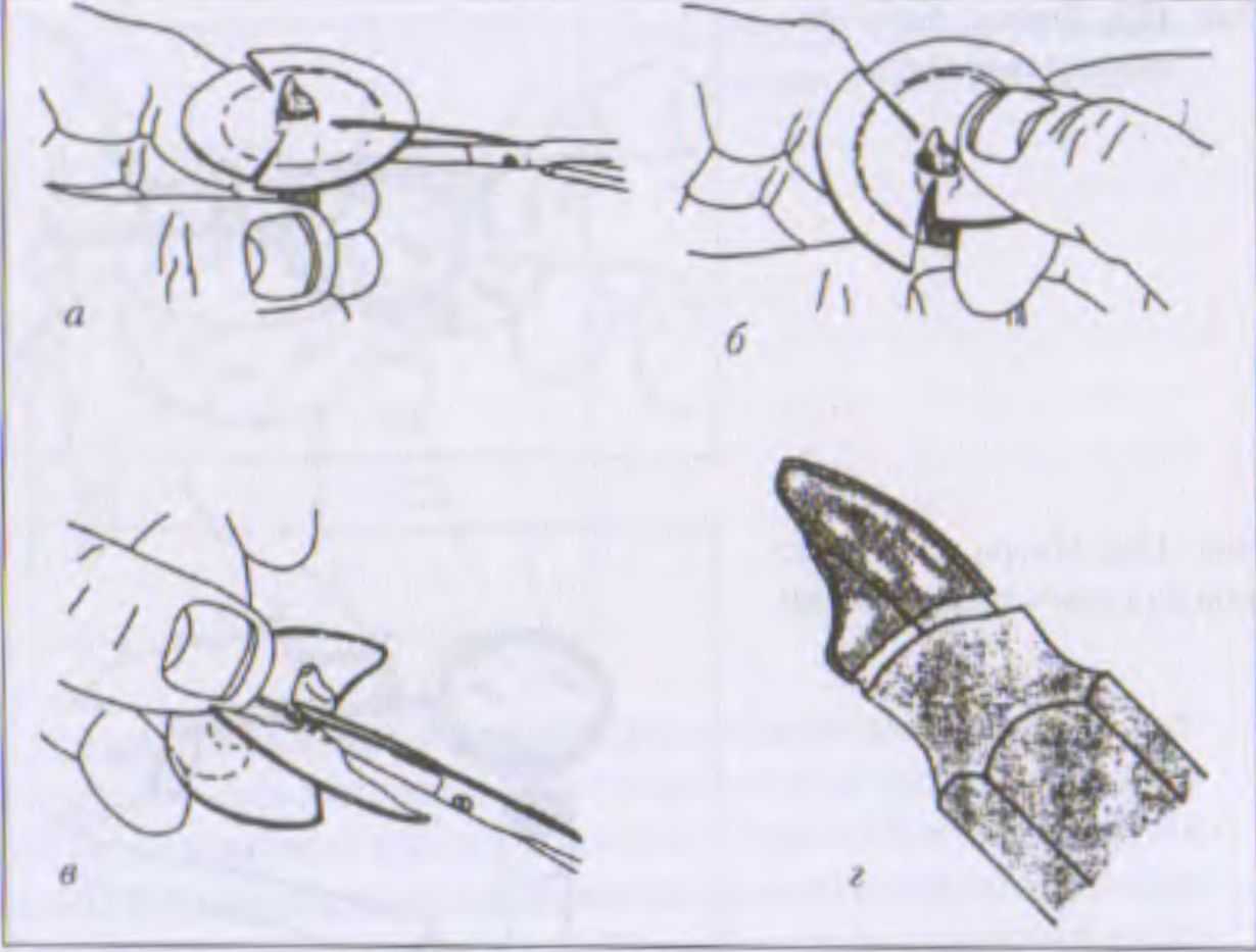 Рис. 106. Последовательность изготовлении пластмассового колпачка: а — разрезание дисков; 6 — удаление внутреннего диска с отпечатком тисовой культи для создания компенсационного пространства; в - укорочение колпачка на модели зуба; г — колпачок с укороченным краем