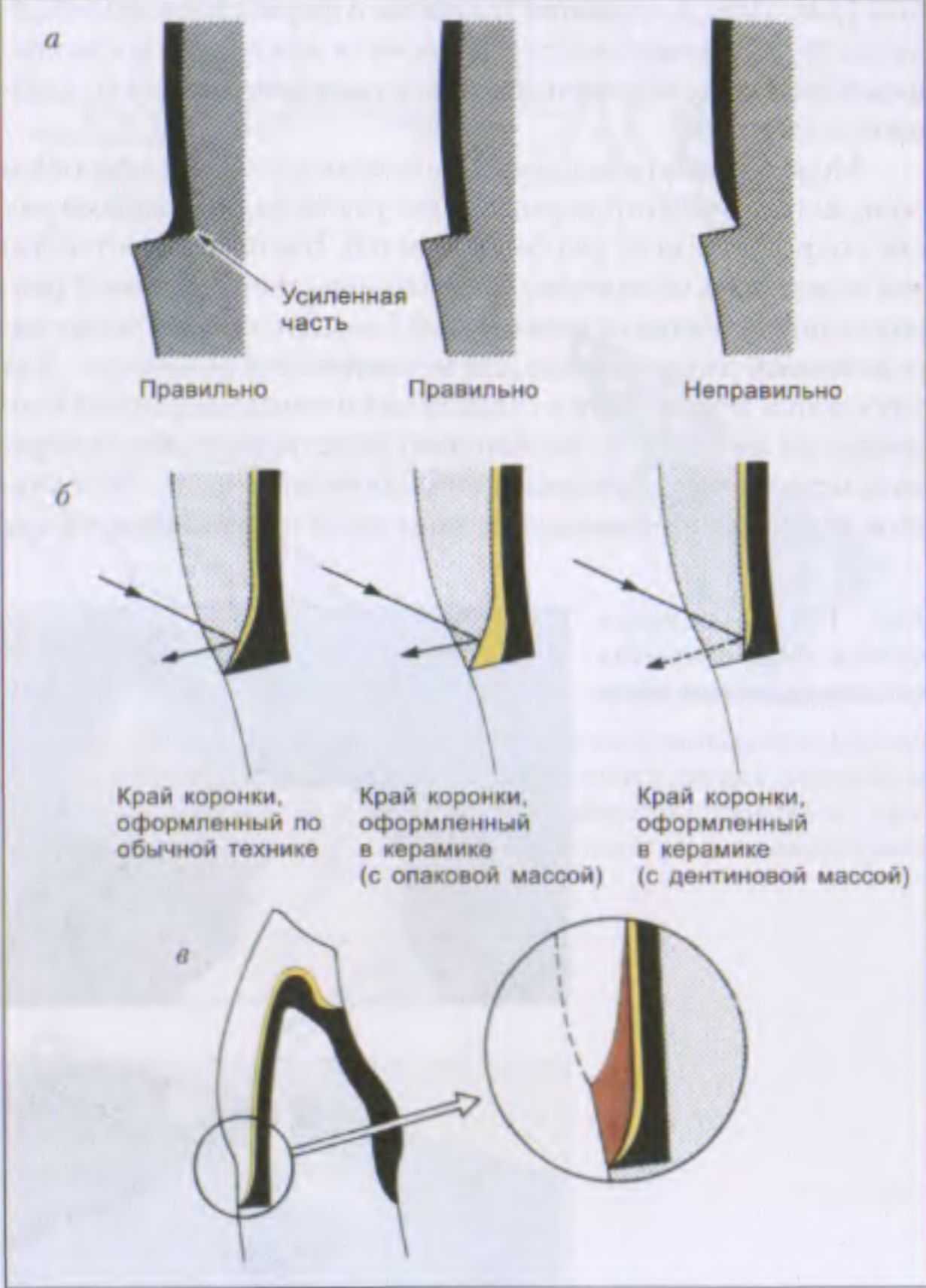 Рис. 110. Особенности конструирования нришеечного края металлокерамической коронки: а — оформление края металлического колпачка: б ■ варианты нанесения керамической массы; в - применение специальной плечевой керамической массы