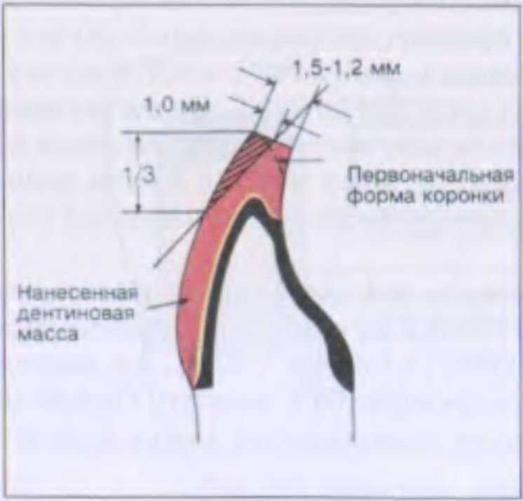 кой массы наносить до получения идеальных контуров коронки, а затем оставлять место для эмалевой и прозрачной массы и, если необходимо, для красителей. Количество, толщина и место размещения дентиновой массы закладывается при ее срезании. Техника срезания, как считает автор, обеспечивает правильное расположение дентиновой, эмалевой и прозрачной массы и создание в связи с этим желаемого цветового эффекта коронки.