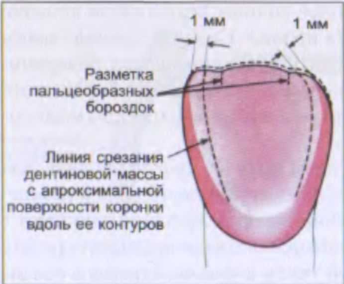 Рис. 116. Разметка дентиновой массы с вестибулярной стороны.