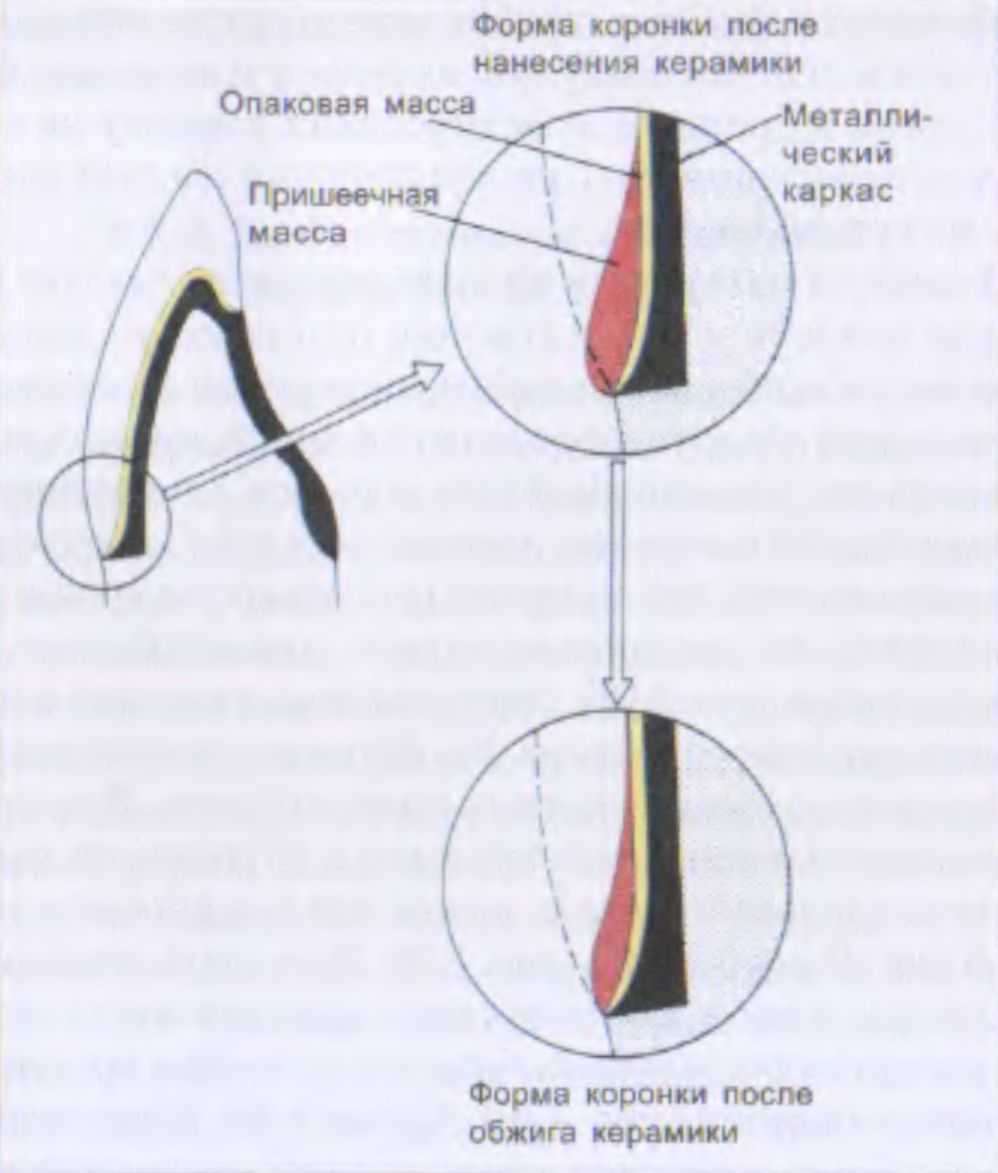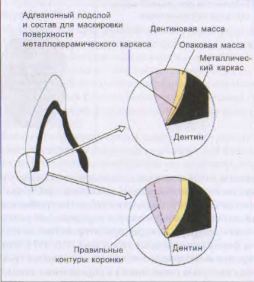 Образующиеся при срезании массы острые углы сглаживают сначала моделировочным инструментом, а затем влажной кисточкой. После этого оценивается толщина слоя оставшейся дентиновой массы. Она считается вполне достаточной, если опаковый слой не просвечивает через влажную дентиновую массу. При этом следует помнить, что опаковый слой не просматривается через сухую дентиновую массу даже при небольшой ее толщине.