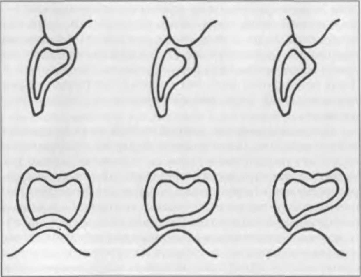 Рнс. 130. Вилы промежуточной части металлокерамнческого мостовидного протеза (верхний ряд - касательная форма для передних зубов. нижний ряд — с промывным пространством для боковых зубов)