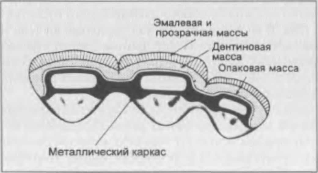 При планировании керамической облицовки опорных коронок следует учитывать вид прикуса, глубину перекрытия передних зубов, высоту клинических коронок и их вестибулооральный размер. При облицовке искусственных коронок для боковых зубов, кроме того, необходимо иметь в виду степень обнажения их при улыбке или разговоре. Полоска металла в виде гирлянды над шейкой зуба оставляется лишь на невидимых для простого осмотра полости рта поверхностях — небных или язычных. Однако в каждом конкретном случае составляется подробный план облицовки всех элементов мостовидного протеза — опорных частей и тела. Рекомендующееся в настоящее время резкое сокращение площади облицовываемых поверхностей (Буланов В.И. с соавт., 1991) должно быть тщательно согласовано с пациентом во избежание конфликта после протезирования. Внимательное отношение врача к возможной этико-психологической несовместимости предупреждает возникновение подобной ситуации.