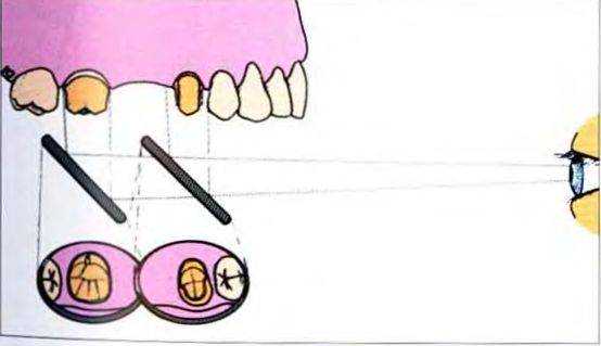 Рис. 1-32. Для оценки параллельности опорных культей мостовидного протеза необходимо сначала оценить качество препарирования одной культи, а затем, не меняя наклона зеркала, подвести его к другому зубу. Должна быть видна вся граница препарирования второго зуба. Необходимость изменения наклона зеркала, для визуализации препарирования второго зуба, указывает на отсутствие параллельности культей, что требует дополнительного препарирования