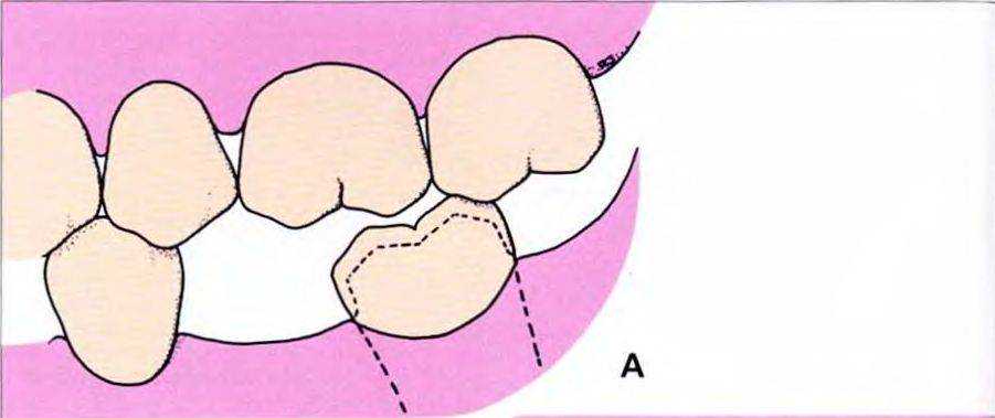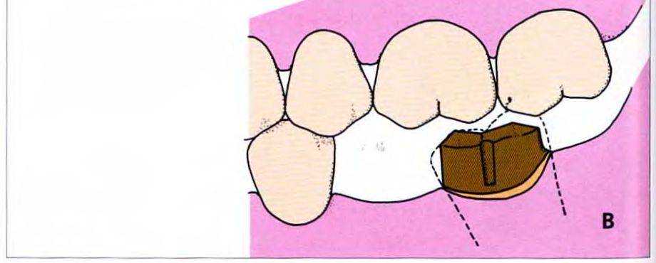 Рис. 1-33. Межокклюзионное пространство в области медиальных бугорков наклоненного зуба достаточно для размещения материала коронки без дополнительного препарирования. Равномерное удаление твердых тканей в таком случае приведет к образованию избыточного пространства в области окклюзионной поверхности и необоснованному укорочению медиальной осевой стенки (А). Необходимо иссекать только такой объем твердых тканей, чтобы можно было разместить реставрацию (В). В некоторых участках исходной окклюзионной поверхности препарирование может совсем не потребоваться