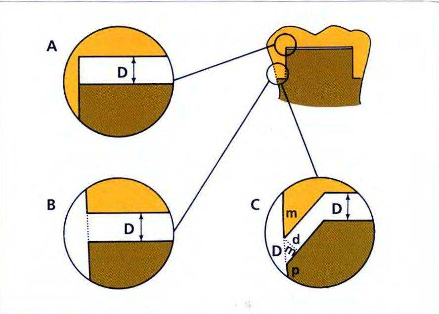 Рис. 2-1. Скос позволяет приблизить край коронки к стенке зуба. В случае прямого уступа расстояние D, на величину которого коронка не полностью садится (А), равно величине краевой щели с! (В). I При наличии скоса кратчайшее расстояние от края коронки до стенки зуба будет меньше, чем D, и j зависит от синуса острого угла m края реставрации или косинуса тупого угла р границы препарирования (С)