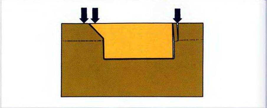 Рис. 2-3. Эмалевый край рядом со скосом способен противостоять нагрузке (слева). Отсутствие скоса может привести к скалыванию эмалевых призм, прилегающих к краю реставрации (справа)