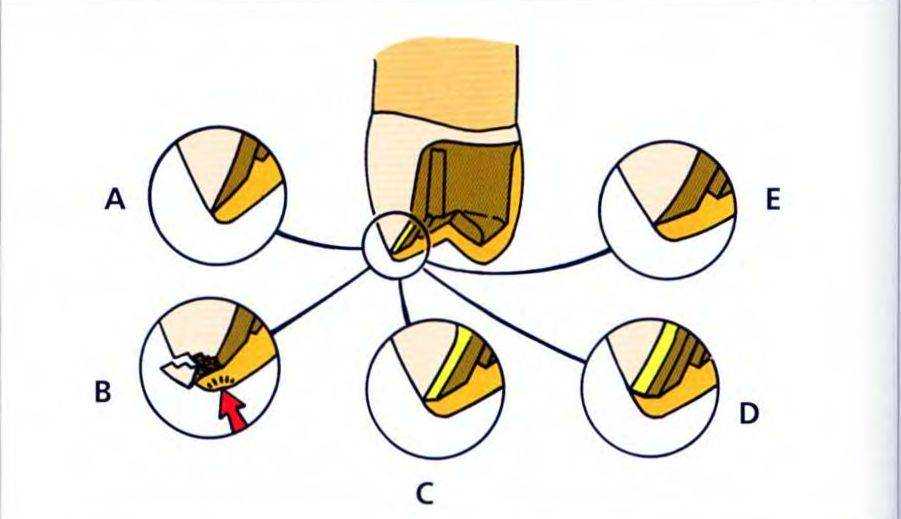 Рис. 2-4. При отсутствии скоса эмаль в области границы препарирования будет иметь хрупкий острый край без подлежащего дентина (А). Жевательная нагрузка может привести к деформации гонкой стенки золотой реставрации и к сколу эмали (В). Край реставрации можно укрепить за счет создания простого скоса по границе препарирования (С) или, если косметические условия позволяют, за счет полного перекрытия бугорка (D). При наличии незначительного наклона окклюзионной поверхности к плоскости препарирования угол перехода стенки зуба на реставрацию может быть достаточно тупым, так что создания скоса для упрочнения края реставрации может и не потребоваться (Е) (Silness")
