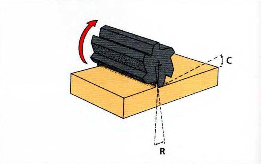 Рис. 3-8. Обычный режущий бор имеет шесть граней (зубцов), разделенных канавками. Каждая I грань имеет три поверхности: переднюю, верхнюю и заднюю. Верхняя и задняя поверхности могут соединяться в одну изогнутую поверхность. Угол между передней поверхностью грани и линией, проведенной от режущей кромки до центра вращения, называется главным передним углом режу- I щего инструмента (R). Угол между верхней поверхностью грани и препарируемой поверхностью называется углом допуска (задним углом) (С). Эти два угла определяют остроту грани