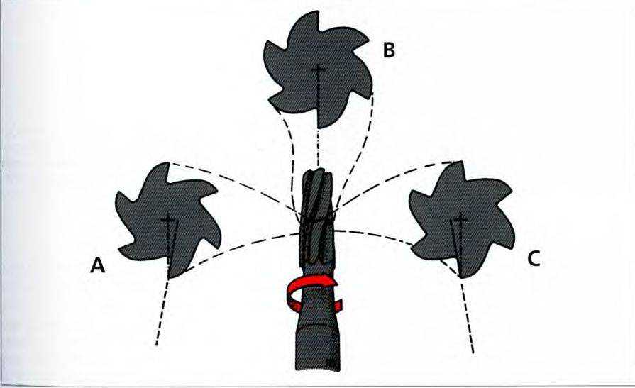 Рис. 3-9. Три типа главного переднего угла. Позитивный угол (А): плоскость верхней поверхности грани лежит кзади от радиальной линии. Несмотря на то что в начале работы такая грань имеет максимальную режущую способность, при препарировании эмали она быстро скалывается и затупляется. Нейтральный или радиальный угол (В): плоскость верхней поверхности грани совпадает с радиальной линией. Негативный угол (С): плоскость верхней поверхности грани лежит кпереди от радиальной линии. Такой дизайн грани позволяет иметь достаточный объем металла кзади от режущего края, что увеличивает продолжительность службы бора. Большинство стоматологических боров имеют либо нейтральный, либо отрицательный главный передний угол