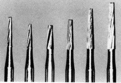 Рис. 3-11. Несколько конусных фиссурных бо- i ров могут быть взаимозаменяемыми: № 169L, ] 170, 171,713-012, 375-014. Боры меньшего диаметра лучше всего подходят для начального ! препарирования проточек и коробчатых полос-1 тей. Инструменты большего диаметра успешно I применяются для сглаживания осевых стенок I