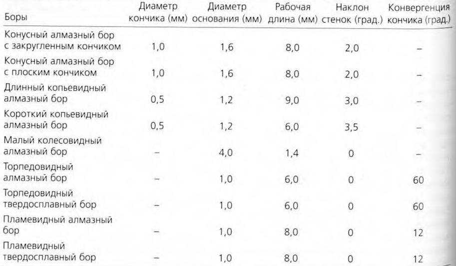 керамические реставрации. Помимо создания проточек, коробчатых полостей и перешейков, они особенно удобны для сглаживания вертикальных стенок культи. Однако традиционные боры 170-й серии с шестью гранями не всегда имеют достаточную длину, а острый кончик может создавать грубый уступ у основания стенки. Существуют конусные полировочные боры большей Длины и диаметра, которыми удобнее выполнять этот этап. Некоторые из широко используемых боров представлены на рис. 3-11. Размеры боров приведены в табл. 3-3.