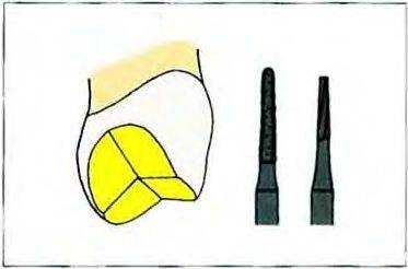 Рис 5-41. Для закругления угла, образованного щечной стенкой окклюзионной проточки и язычным скатом щечного бугорка, используют твердосплавный бор Ns 170.