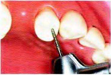Рис. 5-18. После препарирования осевой поверхности приступают к созданию придесневой границы препарирования в виде желоба Этот этап также позволяет проконтролировать достаточность удаления твердых тканей на осевой поверхности Торпедоеидный алмазный бор должен распопагаться в таком положении, чтобы кончик инструмента в области границы препарирования удапял твердые ткани, погружаясь на половину своего диаметра (0,5 мм) Следует максимально сгладить переход между проксимапьной и язычной поверхностями. Нельзя допускать острых углов в области соединения осевых стенок или зазубрин в области желоба