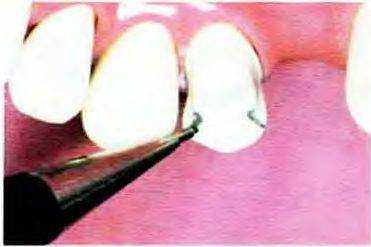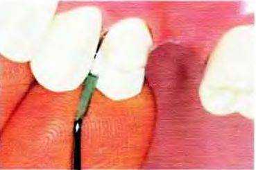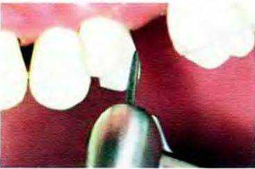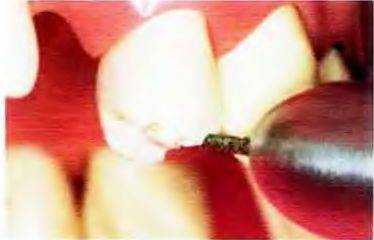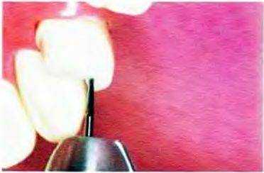 Рис. 5-19. Препарирование проксимальной поверхности со стороны соседнего зуба начинают коротким копьевидным алмазным бором. В этой области бор наиболее эффективен при работе пилообразных движений вверх и вниз