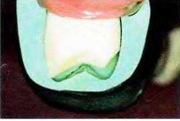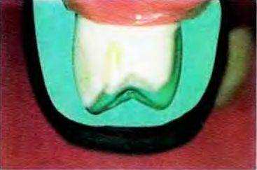 Рис. 5-45. На зубы установлен силиконовый шаблон для демонстрации глубины и формы препарирования, а также локализации относительных размеров конструкционных элементов, таких, как окклюзионмый скос, окклюзионная проточка, скос функционального бугорка
