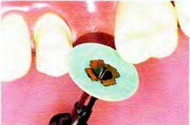 Рис. 5-37. При наличии хорошего доступа срез формируют бумажным шлифовальным диском средней абразивности. Этот метод позволяет создать плоскость необходимого качества. Однако при использовании диска с утраченным абразивным покрытием граница препарирования может быть нечеткой и сглаженной. Во избежание ранения пациента при работе с диском следует убедиться в том. что его губы и щеки защищены пальцами левой руки стоматолога.