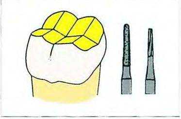 Рис. 6-9. Твердосплавным бором Ns 171 сглаживают препарированные поверхности, которые допжны повторять анатомические особенности окклюзионной поверхности • и не иметь острых углов на кончиках бугорков, поскольку в последующем это помешает плотной установке реставрации.