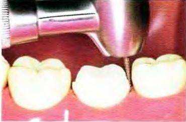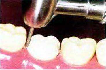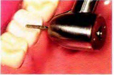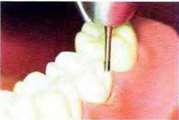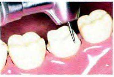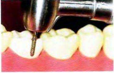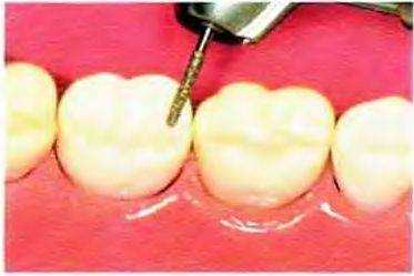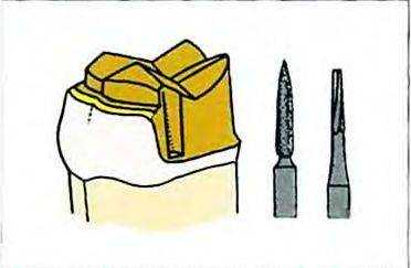 Рис. 6-25. Твердосплавным торпедовидным бором сглаживают поверхность осевых стенок, уделяя особое внимание обработке придесневой границы препарирования