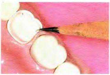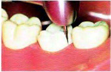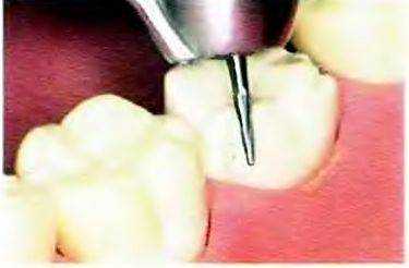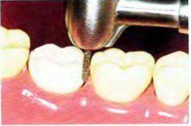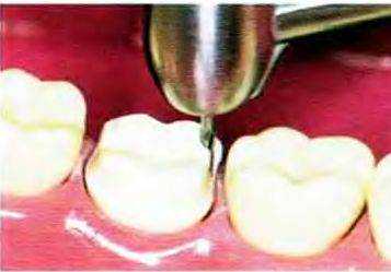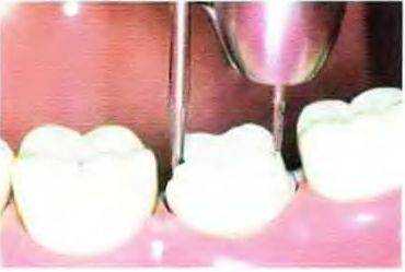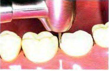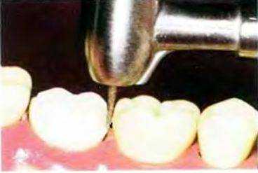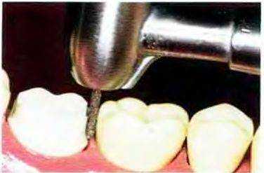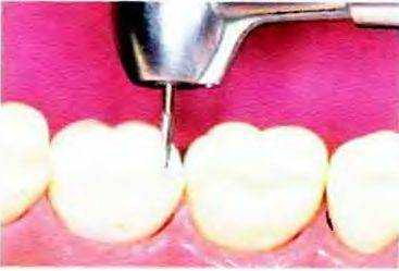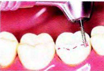 Рис. 6-19. Препарирование проксимальных поверхностей начинают коротким копьевидный алмазным бором. Необходимо использовать пилообразные движения бора вверх и вниз без сильного нажима Следует избегать повреждения соседних зубов и создания излишней конусности проксимальной стенки.