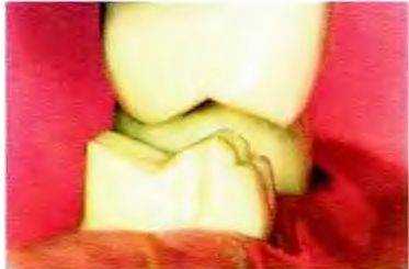 Рис. 6-14. По эстетическим соображениям грепарирование проксимальных поверхностей премоляров ограничено, поэтому вместо прямого уступа можно сделать выраженный желоб