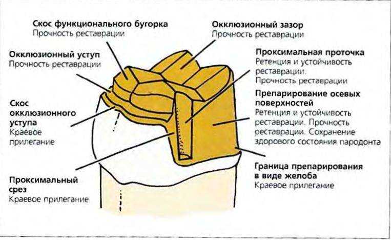 Рис. 6-44. Функциональные элементы культи моляра нижней челюсти, препарированного под трехчетвертную коронку, и их значение