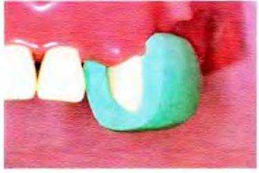 Рис. 7-3. Силиконовый шаблон, охватывающий зуб со всех сторон и рассеченный по горизонтали до середины коронки препарируемого зуба, помогает оценить объем удаленных тканей опорного зуба мостовидного протеза.