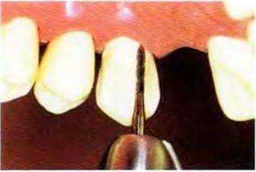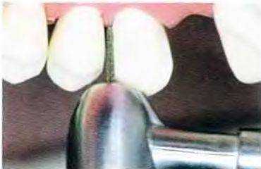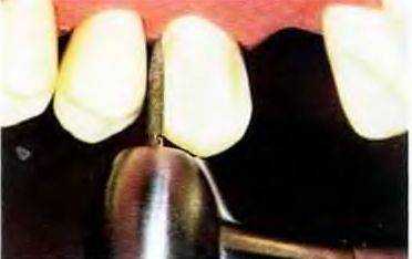 Рис 7-20. В проксимальной области необходимо лишь немного нарушить межзубный контакт с соседним зубом. Бор следует вводить с язычной стороны во избежание чрезмерного расширения границ препарирования Из всех передних зубов только с дистальной поверхности верхних клыков допустим несколько больший объем препарирования. поскольку у большинства пациентов при обычных условиях на «расстоянии общения» дистальная поверхность не видна