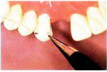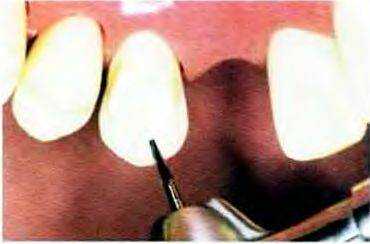 `ис 7-13. Торпедовидным алмазным бором препарируют вертикальную стенку небного буорка и создают придесневую границу препарирования в виде желоба.
