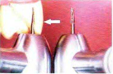 Рис. 7-27. После препарирования проточки на всю глубину необходимо оценить ее направление и размеры Для этого бор помещают в проточку и перемещают наконечник в щечную сторону. строго придерживаясь заданного направления во избежание изменения наклона бора