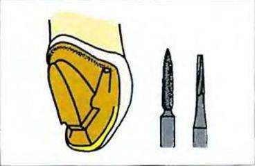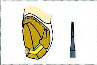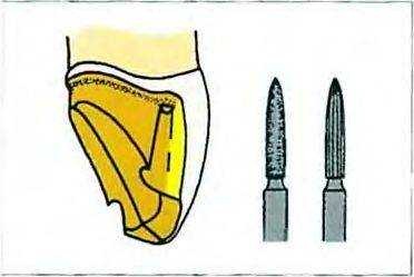 Рис. 7-30. Срез на щечной стенке проточки создают пламевидным алмазным бором. Срез представляет собой ровную плоскость, расширяющуюся от придесневои части к режущему краю На проксимальной поверхности, обращенной в сторону дефекта зубного ряда, как в приведенном случае, можно работа гь всей боковой поверхностью пламевидного бора. При затрудненном доступе к проксимальной области препарирование среза начинают в придесневой части тонким кончиком бора, постепенно перемещаясь в сторону режущего края